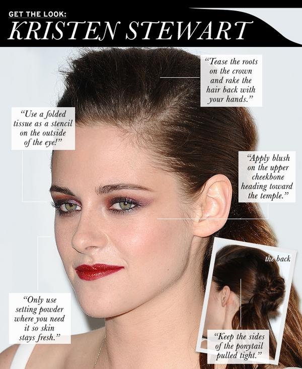 Friday, November 16, 2012 It's generally accepted that you have to choose between a bold lip or a smoky eye, but Kristen Stewart proved otherwise at the Los Angeles premiere of On The Road. Makeup artist Jillian Dempsey wanted to give the actress even "more edge than normal" with a vampy lip and ruby-colored, smoky eyes to complement her menswear-inspired Balenciaga ensemble. Hairstylist Adir Abergel followed suit, creating an "androgynous, roughed-up ponytail."